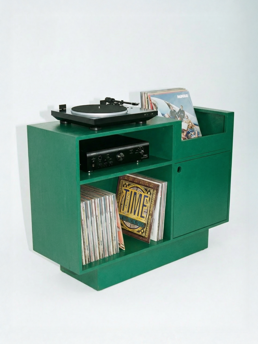Hidden Storage: The bottom-right cabinet features a door with our signature circular cutout handle, perfect for storing box sets, cleaning kits, or additional records dust-free.